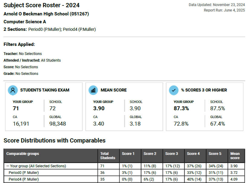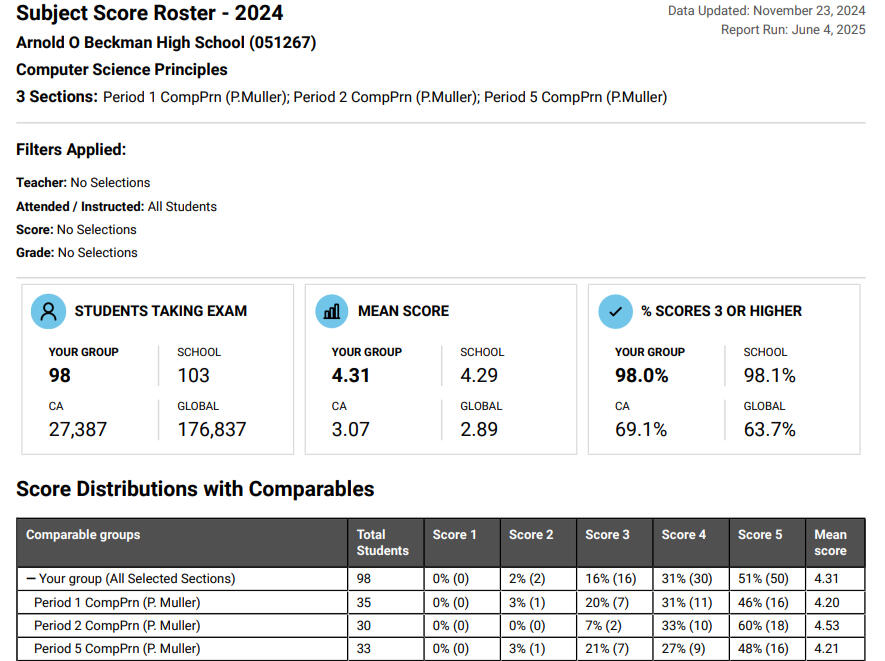 "Mr. Muller is an amazing teacher who made learning computer science interesting and fun! He sparked my interest in computer science as a career and I was excited for class everyday." -Anisa M."Mr. Muller was super patient when it came to helping me. He's very good at giving advice without solving problems for you, so I definitely learned a lot from him. Overall, he was a great teacher!" -Alesha Q."Mr. Muller taught us all the computer science we know. He’s a very engaging and entertaining teacher, as well as patient and knowledgeable. We definitely recommend him!' - Cathy & Andy N.